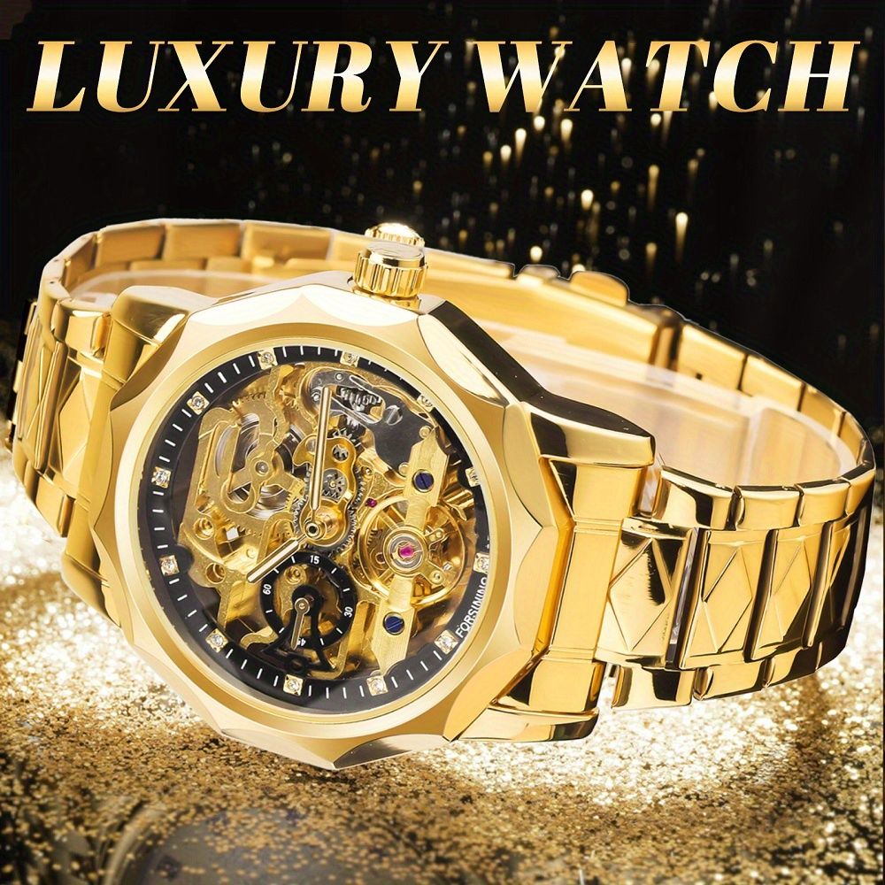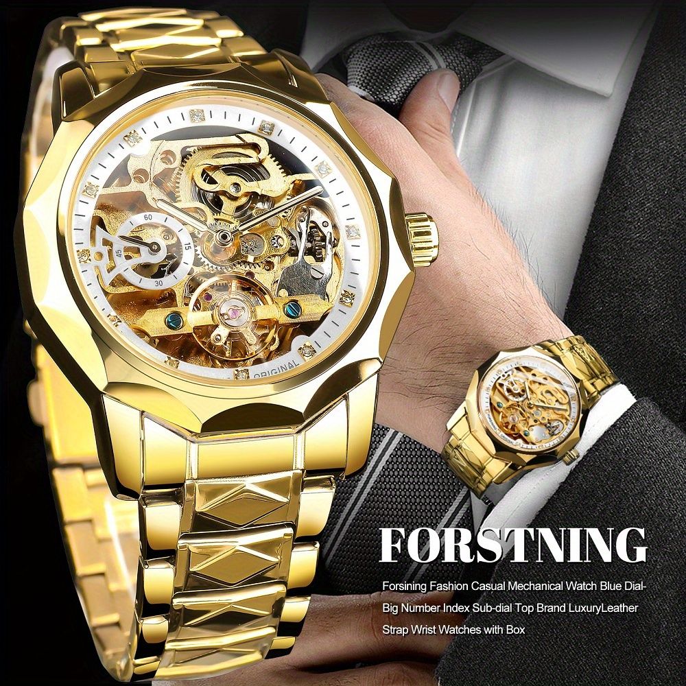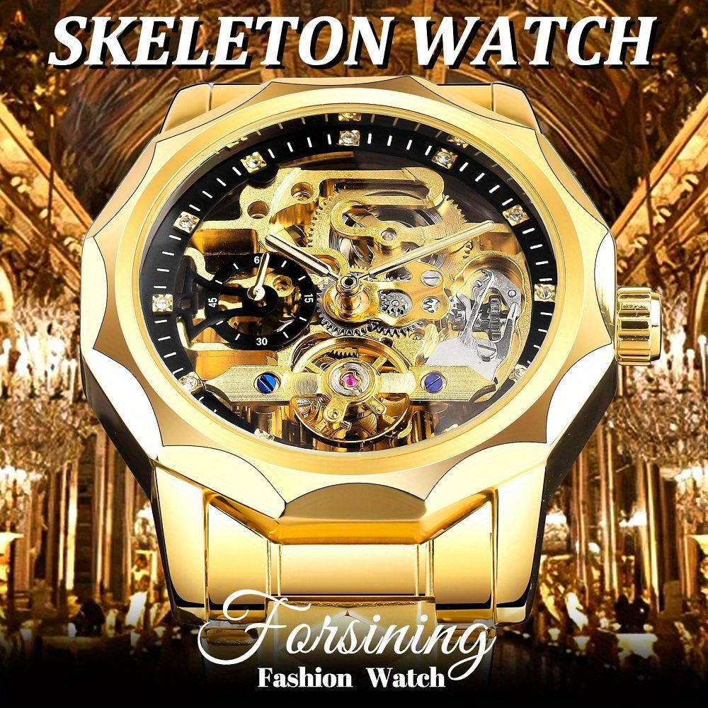 Relógio automático de luxo para homens — Mostrador esvaziado com ponteiros esvaziados, pulseira de aço inoxidável e caixa poligonal, uma combinação que exala sofisticação instantânea. Elegância versátil para negócios e lazer, ele complementa perfeitamente o estilo do homem moderno e ambicioso. Sem necessidade de bateria, o movimento mecânico preciso marca cada momento com confiabilidade. Seu companheiro indispensável para fechar negócios, reuniões importantes e qualquer ocasião que exija classe!