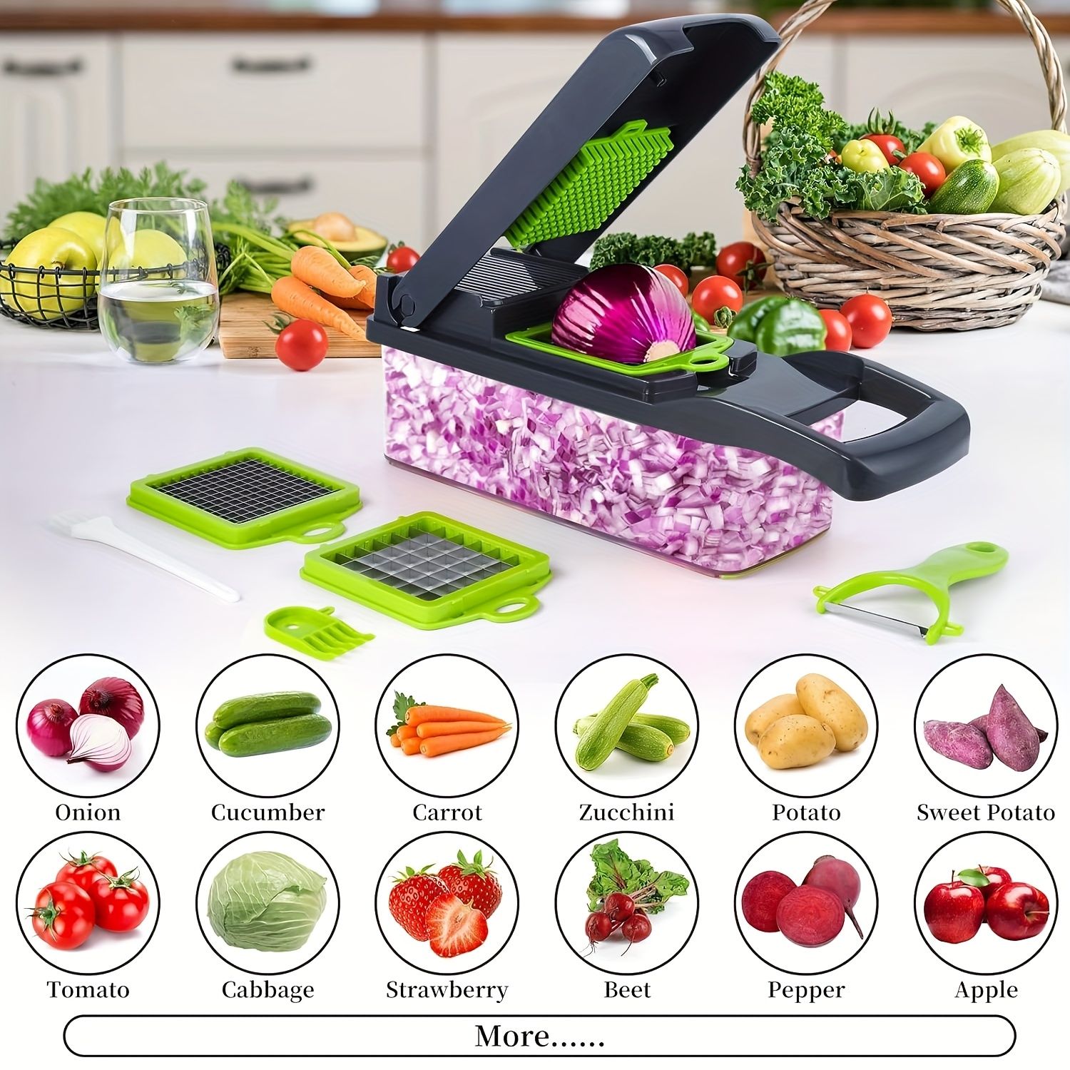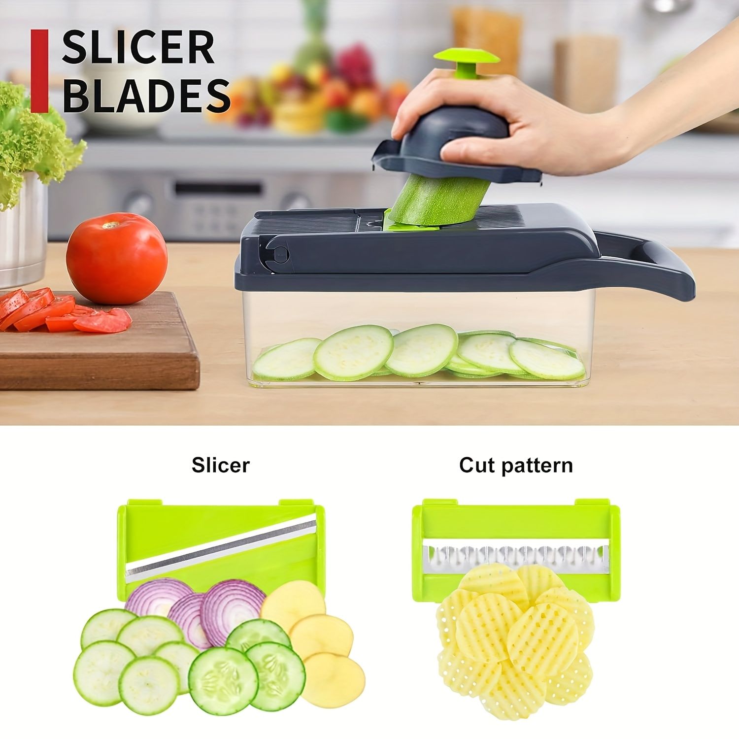 Conjunto Profissional de Cortador de Alimentos 16 em 1 (Atualizado): Design ajustável de alta qualidade, equipado com 8 lâminas intercambiáveis, recipiente, ralador, filtro e separador de gema. Suporta julianas, fatias, dicas de legumes, trituração de legumes, fatias de frutas, e trata cebola, cenoura e alho — perfeito para chefs casuais!