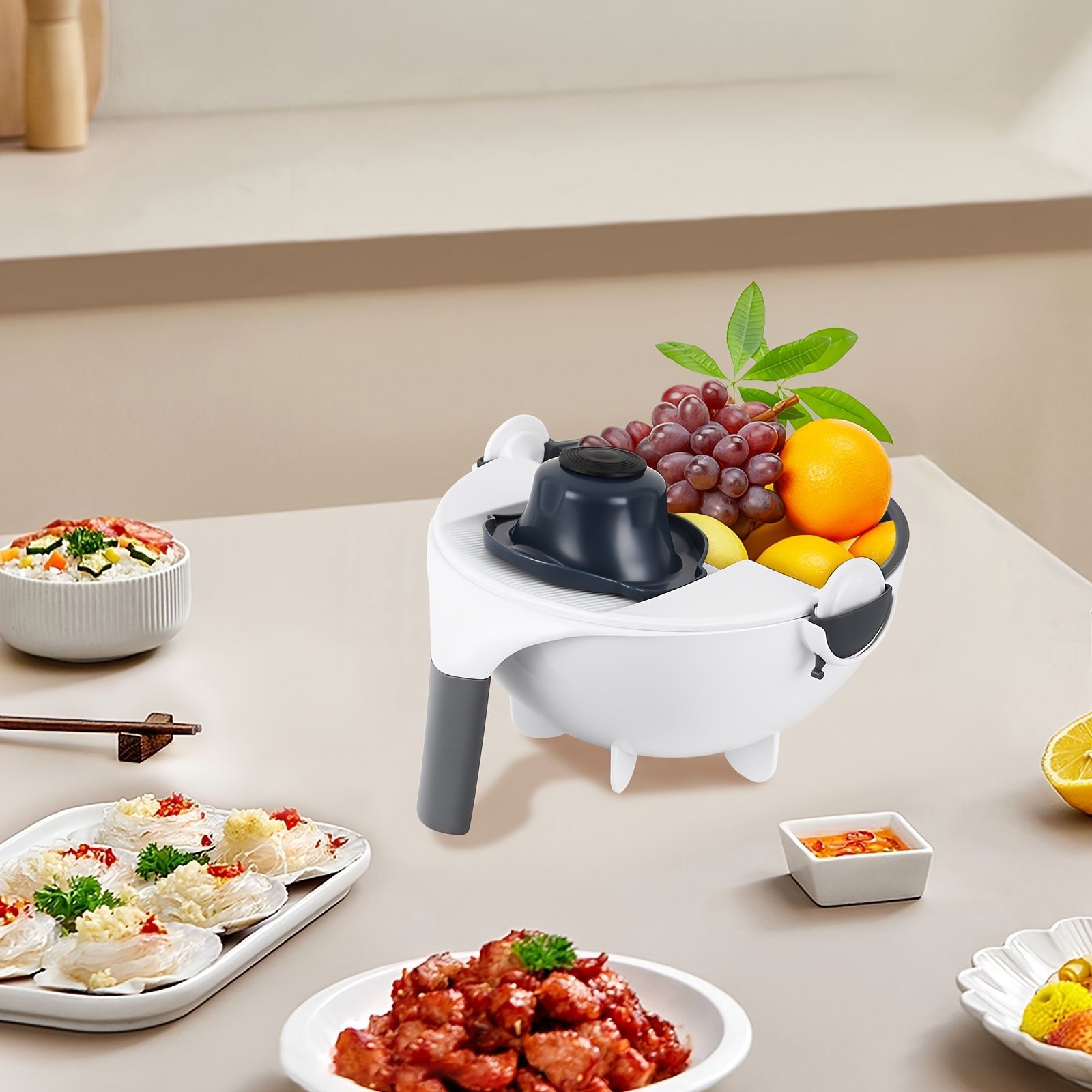 Cortador de Legumes Rotativo 9 em 1: praticidade e eficiência em um produto! Com cesta de escorrimento, cortador, ralador e fatiador multifuncional de grande capacidade. Design ergonômico, plástico durável e sistema de drenagem eficaz – ideal para cozinha diária!