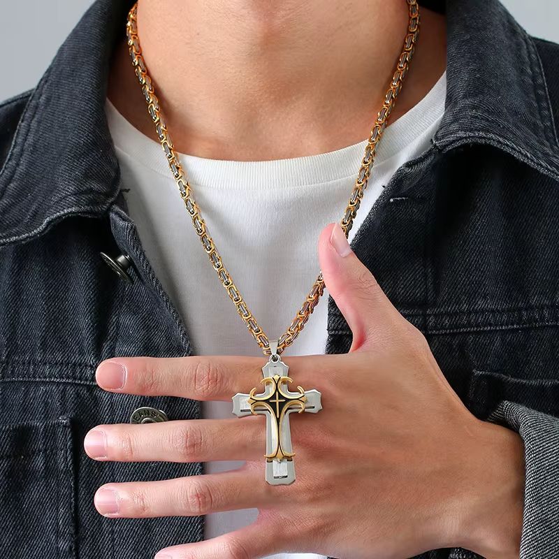 Colar de Cruz de Aço Inoxidável de Duas Camadas, Design Elegante e Durável, Ideal para Uso Diário e Presente Cristão.