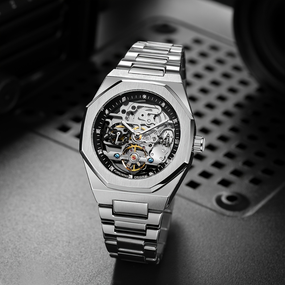 Relógio mecânico de luxo masculino com tourbillon esquelético e ponteiros 夜光!Pulseira de aço inoxidável, caixa irregular, estilo casual e elegante. Ideal para presentear no Natal: é automático, sem bateria, resistente e feito com artesanato de alta qualidade. Perfeito como acessório formal ou para o dia a dia, um relógio que combina luxo e praticidade.