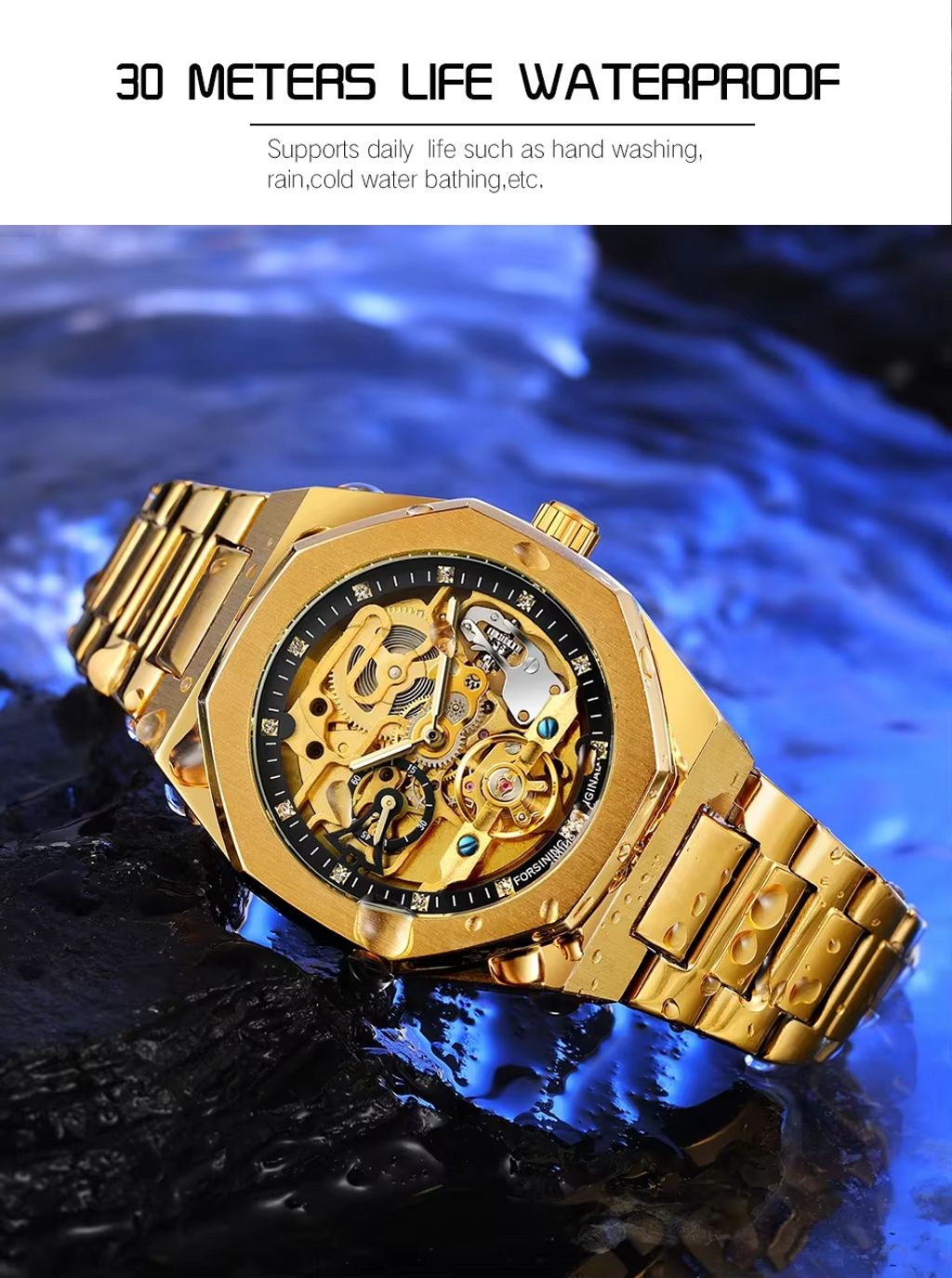 Relógio masculino de polígono dourado