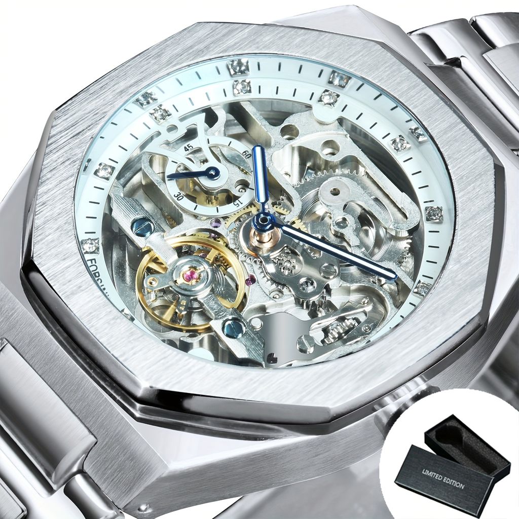 Relógio mecânico de luxo masculino com tourbillon esquelético e ponteiros 夜光!Pulseira de aço inoxidável, caixa irregular, estilo casual e elegante. Ideal para presentear no Natal: é automático, sem bateria, resistente e feito com artesanato de alta qualidade. Perfeito como acessório formal ou para o dia a dia, um relógio que combina luxo e praticidade.